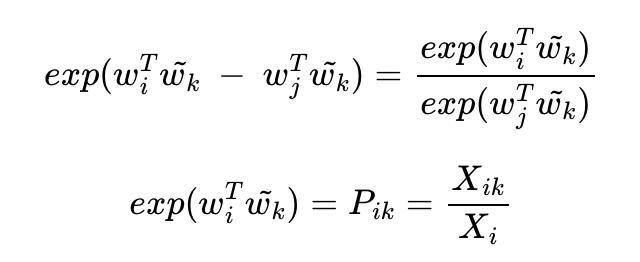 여기에 양변에 로그를 취하고, 중심 단어와 주변 단어를 바꿔도 식이 성립하기 위해 wi와 wk에 대한 편향을 각각 추가합니다.