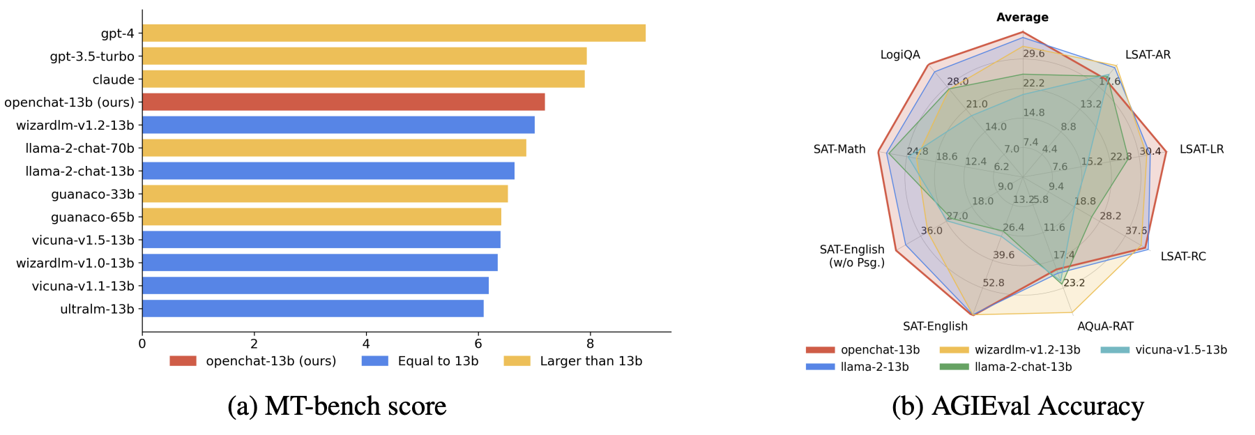 최근 LLM을 파인튜닝하는 방법론에는 SFT(Supervised Fine-Tuning)과 RLFT(Reinforcement Fine-Tuning)이 있는데, SFT는 데이터의 품질을 보장할 수 없다는 단점, RLFT에는 데이터를 구축하는 데에 비용이 많이 들어간다는 단점이 존재한다. OpenChat은 이러한 단점을 극복하기 위해 데이터 소스에 따라 강화학습 보상을 다르게 부여하는 C(onditioned)-RLFT 방법론을 제시한다. OpenChat13B 모델은 오픈 소스 13B 모델 중에서 가장 좋은 성능을 보였다.